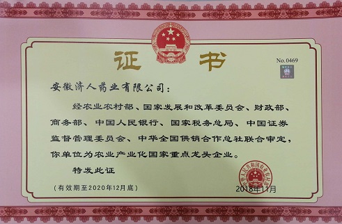2018年12月20日,安徽济人药业有限公司顺利通过农业农村部第八次“农业产业化国家重点龙头企业”检测。根据《农业产业化国家重点龙头企业认定和运行监测管理办法》(农经发〔2018〕1号)规定,农业农村部对国家重点龙头企业实行动态管理,每两年进行一次监测评估,做到有进有出、等额递补。