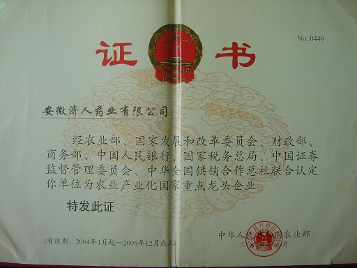 安徽济人药业有限公司是2004年亳州市首家获得 “农业产业化国家重点龙头企业”荣誉称号单位。多年来,安徽济人药业有限公司不忘初心,凝心聚力,主动融入乡村产业振兴之中,不断增强内生动力、发展活力和整体经济实力。